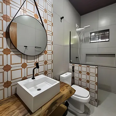 Die Badezimmer in der Casa Lisboa Com Piscina E 3 Suites Em Bonito sind mit einer getrennten Toilette und einer Dusche ausgestattet. Die Bäder verfügen auch über Badelaken für zusätzlichen Komfort.